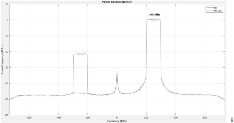 Figure 9 shows 400 MHz NR 5G signal centered at 200 MHz and an image signal at −200 MHz. The image is about −20 dB below the main signal before applying the QEC algorithm and goes to −45dBc after applying the QEC algorithm.