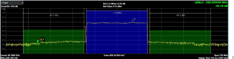 Figure 6 shows a capture from the analyzer screen for a 100 MHz new radio (NR) 5G signal centered at 28.150 GHz and an image signal at 27.850 GHz (in the blue trace). The image signal is more than −25 dB below the main (yellow) signal (that is, the image rejection <25 dB). When applying the QEC algorithm, the image signal is suppressed.