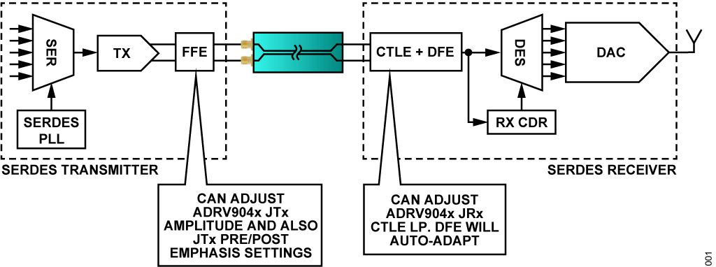 The ADRV904x devices use a SERDES high-speed serial interface based on the JESD204B/JESD204C standards to transfer analog-to-digital converter (ADC) and digital-to-analog converter (DAC) samples between the transceiver device and a baseband integrated chip (BBIC) or field-programmable gate array (FPGA). The PHY block in the ADRV904x deserializer JRx side uses a continuous time linear equalizer (CTLE) plus a decision feedback equalizer (DFE) to decode the serial bits correctly after passing through the lossy channel.