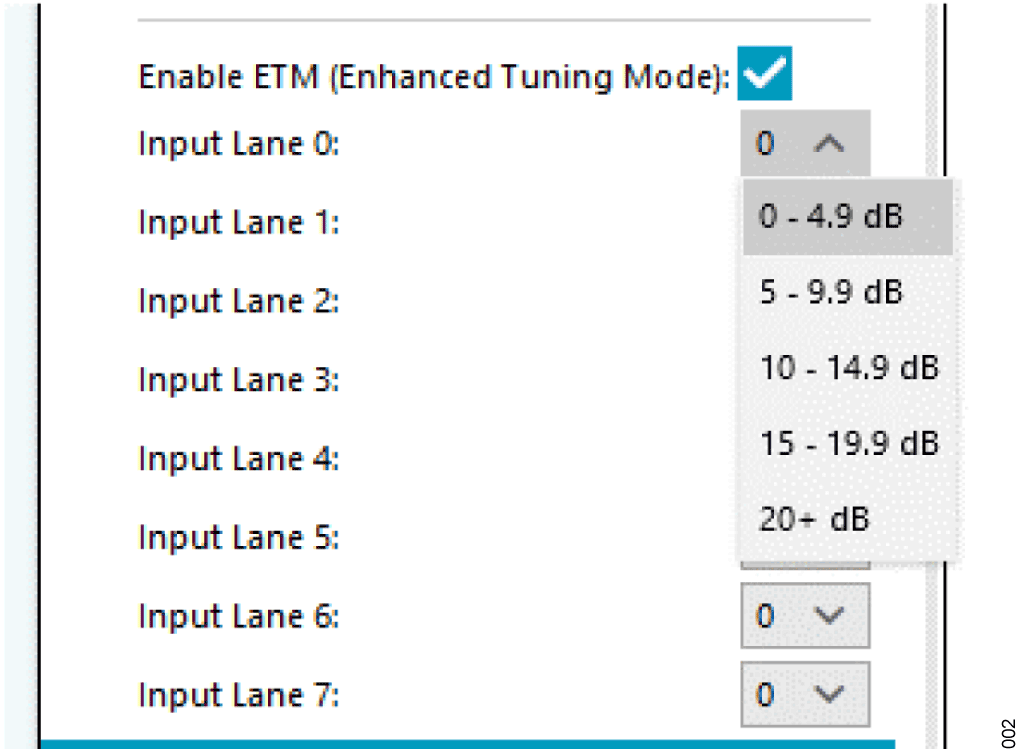 To enable this, select Enable ETM (Enhanced Tuning Mode) in the JESD deframer section under basic JESD in analysis, control, evaluation (ACE) graphic user interface (GUI), and enter in an insertion loss range per lane in the GUI. This insertion loss pulldown is shown in Figure 2. Note, if the insertion loss range for a given lane straddles across two selections, for example 4 dB to 7 dB, then enter the closest range value at first. You can test and compare the other insertion loss range values as described in the SERDES Link Tuning section. This insertion loss range then gets translated to an lpfMask value depending on the SERDES lane rate as shown in Table 1.