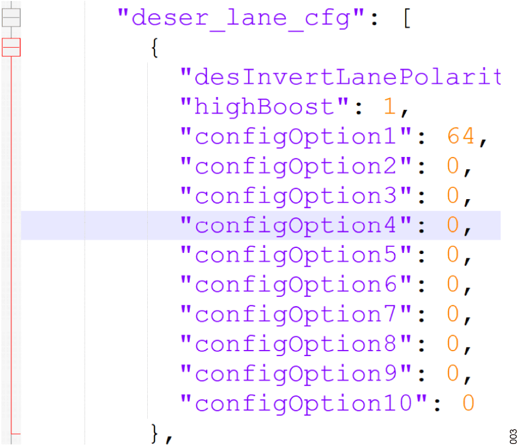 This value gets written in the JSON file by the GUI/configurator automatically, which edits configOption1 in the deser_lane_cfg section of the JSON per lane. For example, if 0 dB to 5 dB insertion loss range for all lanes at 16 Gbps is set, then configurator writes “configOption1”: 64 for the eight lanes. The highBoost parameter must also be set to a 1 by the configurator. You must not manually set the highBoost or configOptions settings unless given a configuration setting by Analog Devices.
