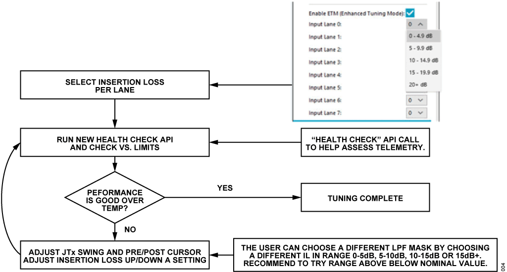 The settings for the calibrations are mostly default in software depending on the SERDES lane rates used, for example the default parameters are different for 16 G vs. 24 G operation. These calibration settings defaults are chosen based on internal Analog Devices, Inc. characterization. However, there is still some programmability needed to cater for trace length and associated insertion loss variations, as this is determined by the unique printed circuit board (PCB) SERDES lane layout. To keep this adjustment as simple as possible, the ADRV904x parts have a single parameter that needs to be adjusted depending on the insertion loss at a respective lane rate.
