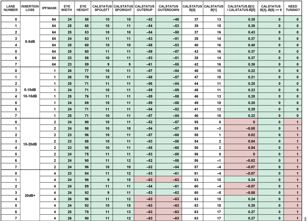 An example of the output data is given in Figure 5. In this case, a 16 G SERDES use case is selected and a sweep done through the 4 × lpfMask settings by adjusting the insertion loss dropdown ranges. The lpfMask setting is recorded in Column C. The four checks are shown in the CALSTATUS B[3]_B[6] ≧ 8 column that are highlighted green if they pass and highlighted red if they fail. Note that Check 5 was omitted in this measurement. The logical OR of the check results, for example the summary check, is shown n the last column, which is the Need Tuning? column, where a 0 indicates a pass and a 1 indicates a fail. If only the eyeHeight and eyeWidth are considered as the pass/fail criteria, then all 4 × lpfMask settings are given a pass result. However, if the other three checks are considered, then the lpfMask settings of two and four fail on all lanes. That means for this measurement on the Analog Devices evaluation board with its associated insertion loss, an lpfMask value of 64 (super low) or 1 (low) is recommended.