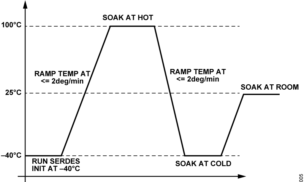 Once a stable link is achieved along with the metrics indicating the link is good and with no tuning needed, you must test this over temperature to ensure link stability across temperature. Typically, you must run the SERDES InitCal at one temperature extreme, drift to the other temperature extreme, and back to room temperature, which allows soak time at each temperature point. An example temperature profile is shown in Figure 6. Using the SerdesTrackingCalStatusGet() API, you can read the tracking calibration metrics at frequent temperature intervals, for example 10°C, and store to a file for post processing vs. the limits given in the SERDES Metrics Limit Checks Pseudocode section. Note, the same limit checks given in the SERDES Metrics Limit Checks Pseudocode section can be used.
