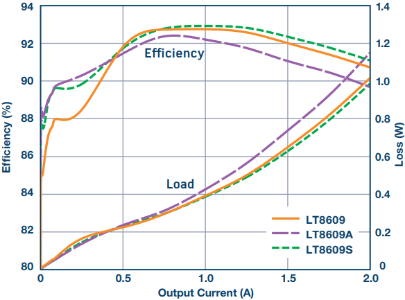 During light load operation and no-load standby mode, high efficiency and low idle current are important for battery-powered applications. The LT8609, LT8609A, and LT8609S feature a low 2.5 µA quiescent current in Burst Mode® operation. During light load and no-load conditions, the switching frequency is gradually reduced, greatly reducing power loss while keeping the output voltage ripple relatively low. Figure 2 shows that light load efficiency remains above 85% while the power loss approaches zero at minimal loads.