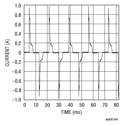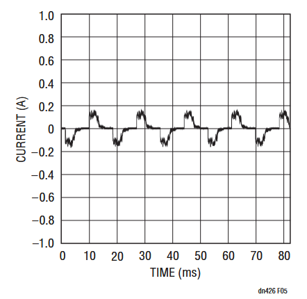 Figure 2 shows the AC line voltage in Linear Technology’s Mixed Signal lab. The flattened peaks are typical of the voltage in an office building where many of the loads are nonlinear, such as computer power supplies. Figure 3 shows the current through a 50W incandescent bulb. Figure 4 shows the current through a 15W compact fluorescent bulb, and Figure 5 is the current through a 4W LED-based bulb. The 5MHz full linear bandwidth of the LTC2351-14 allows analysis of high frequency components of the line voltage and current, limited in this case by the bandwidth of the sense transformers.