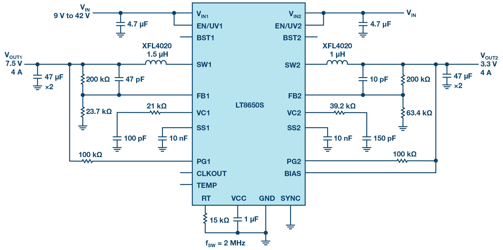LT8650S具有宽输入电压范围、低静态电流和Silent Switcher 2型设计的特点。将两个4 A同步降压稳压器集成在一个4 mm × 6 mm封装中,有利于减少器件数量,降低解决方案尺寸,同时还能为多种应用带来设计上的灵活性。