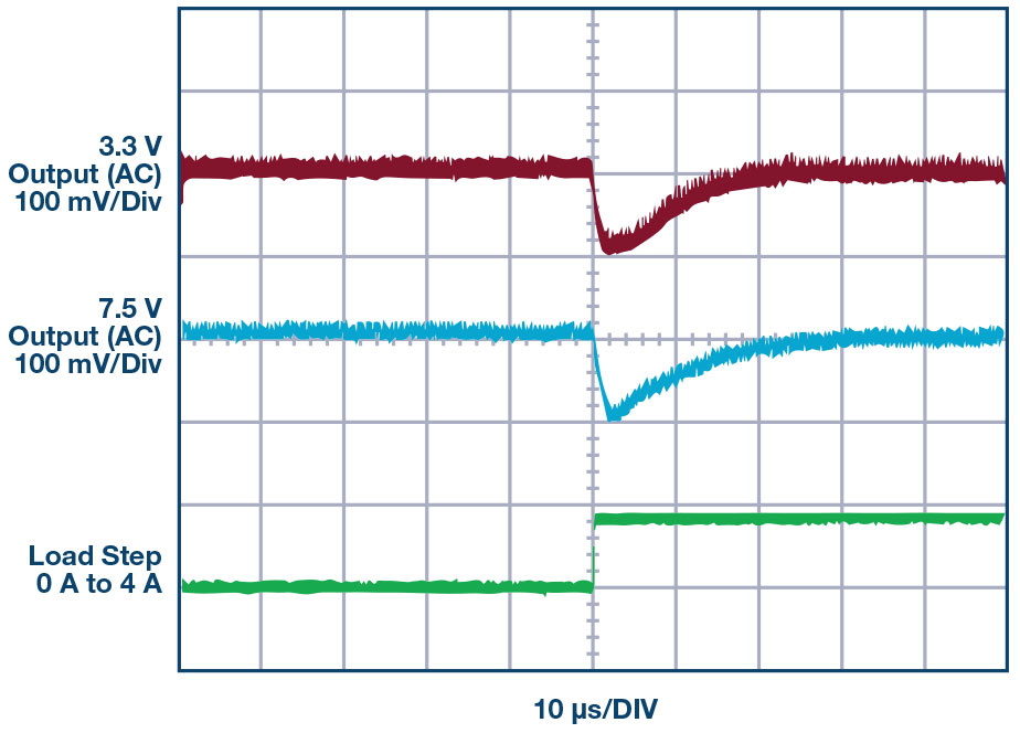 图2所示为在0 A至4 A负载阶跃下的输出响应,其中,在输出电压为3.3 V和7.5 V时,VOUT降幅低于100 mV。这一响应加上高初始精度,可以打造出符合严格VOUT容差标准的解决方案。