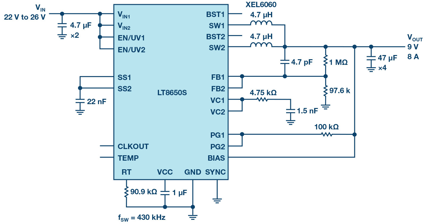 输入电压为12 V时,温度和效率甚至表现更好。并联时,需要通过把误差放大器的输出端捆绑起来,平衡输出端之间的电流。这可以通过把VC1和VC2连接起来并使用外部补偿的方式来实现。对于要求较大热预算的应用,LT8650H的工作结温为150°C。