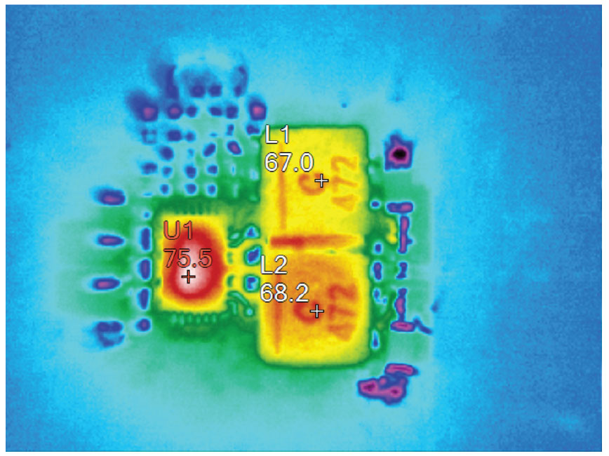 LT8650S集成了两个同步降压稳压器,采用4 mm × 6 mm封装。可以轻松将两个输出端并联起来,以实现高电流,如图3中的72 W输出、24 V输入设计。全负载下的效率为95%,电路板的热性能如图4所示。在室温下运行时,如果不采用主动式散热机制,IC最热部分的温度达75°C左右。