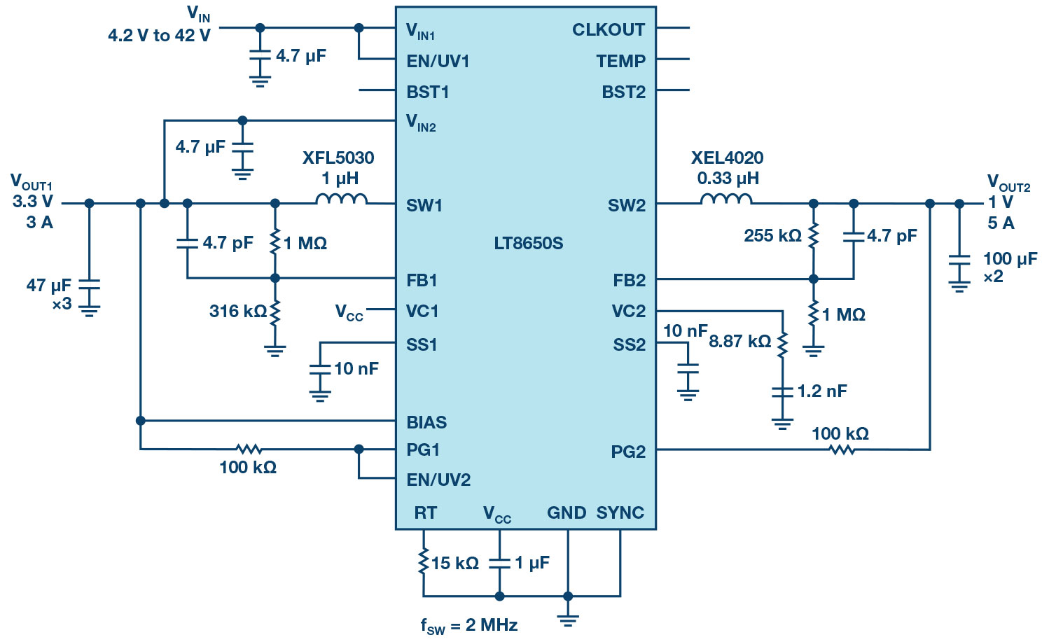 面向SoC应用、工作频率为2 MHz的3.3 V/3 A和1 V/5 A电路