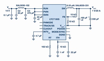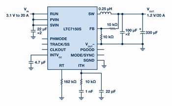 图1显示使用LTC7150S,开关频率为1MHz时,为SoC和CPU供电的20 A、1.2 V输出解决方案。该电路非常易于修改,以适应其他的输出组合,包括3.3 V、1.8 V、1.1 V和0.6 V,从而充分利用LTC7150S的宽输入范围。LTC7150S具有可作为第一级5 V电源的输出电流能力,支持后接多个不同输出的后端二级开关稳压器或LDO稳压器。