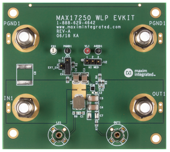 MAX17250 WLP评估板(EV kit)评估采用晶圆级封装(WLP)的MAX17250 IC。MAX17250为高效、低静态电流、同步升压型DC-DC转换器,具有真关断(Shutdown™)、可编程输入限流和短路保护。MAX17250评估板工作在2.7V至18V输入电压范围,取决于具体负载。评估板提供3V至18V电阻可配置输出电压。输入峰值限流可设置为3.5A/2.7A/1.85A电流。评估板已安装MAX17250ANC+ (WLP)。