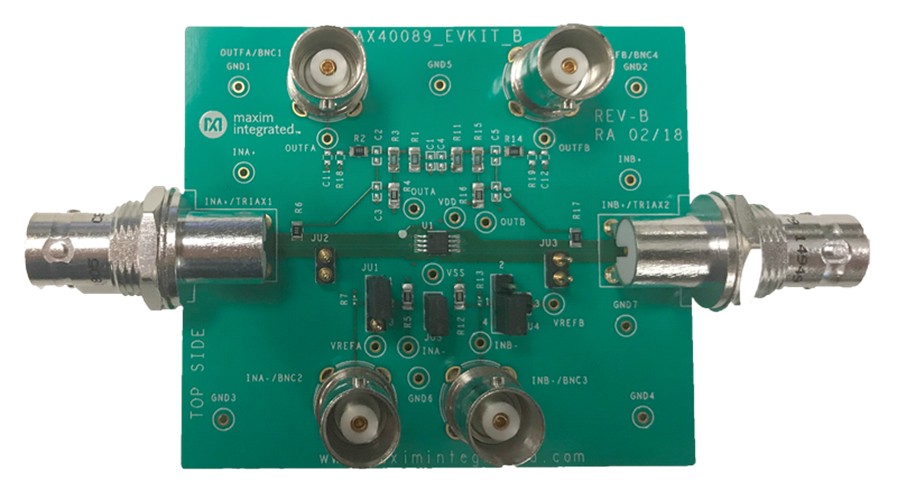 MAX40089评估套件(EV kit)为完全装配并经过测试的电路板,包括评估MAX40077和MAX40089双通道运算放大器所需的全部元件。