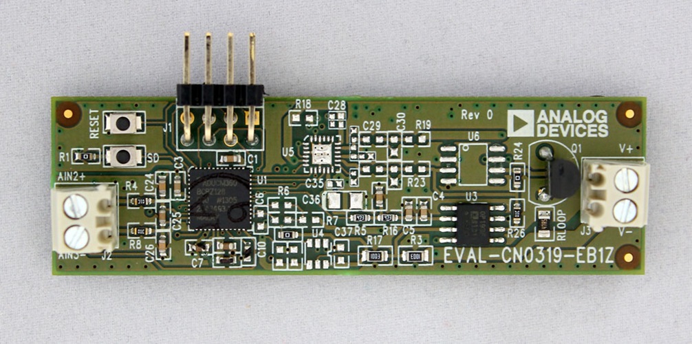 电路采用线性稳压器 ADP1720 供电,可将环路加电源调节至3.3 V,为 ADuCM360、运算放大器 OP193和可选基准电压源 ADR3412提供电源。