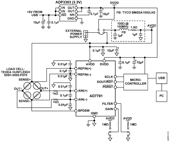 除外部称重传感器和PC外,图1所示电路均包含在AD7780评估板(EVAL-AD7781EBZ)上。