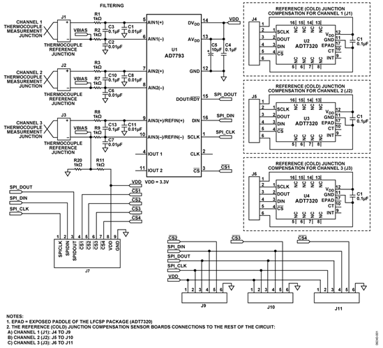 采用热电偶连接器和滤波器作为热电偶与AD7793 ADC之间的接口。每个连接器(J1、J2和J3)都直接与一组差分ADC输入相连。AD7793输入端的滤波器可在信号到达ADC的AIN(+)和AIN(−)输入端之前降低任何热电偶引脚上叠加的噪声。AD7793集成片内多路复用器、缓冲器和仪表放大器,可放大来自热电偶测量结点的小电压信号。