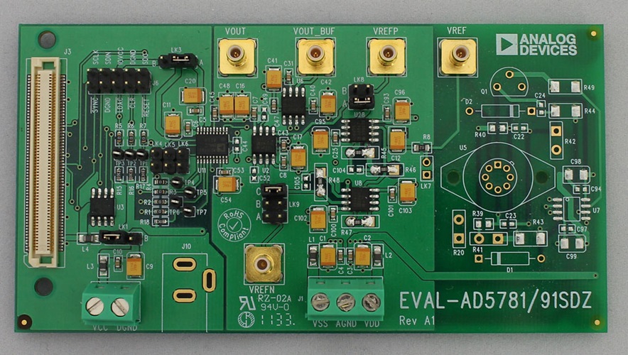 图1所示电路在经过修改的AD5791评估板上构建。有关AD5791评估板和测试方法的详细信息,参见评估板用户指南 UG-185。