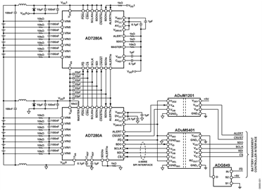 AD7280A菊花链从它监控的电池单元获得电源。ADuM5401集成一个DC/DC转换器,用于向ADuM1201的高压端供电,向AD7280A SPI接口提供VDRIVE 电源,以及向AD7280A菊花链电路提供关断信号。如果BMS低压端的+5 V电源被拉低,则隔离器和AD7280A菊花链关断。同样,如果来自BMC的PD信号变为低电平,通过 ADG849 开关路由的ADuM5401低压电源将被拉低,这也会使隔离器和AD7280A菊花链发生硬件关断。