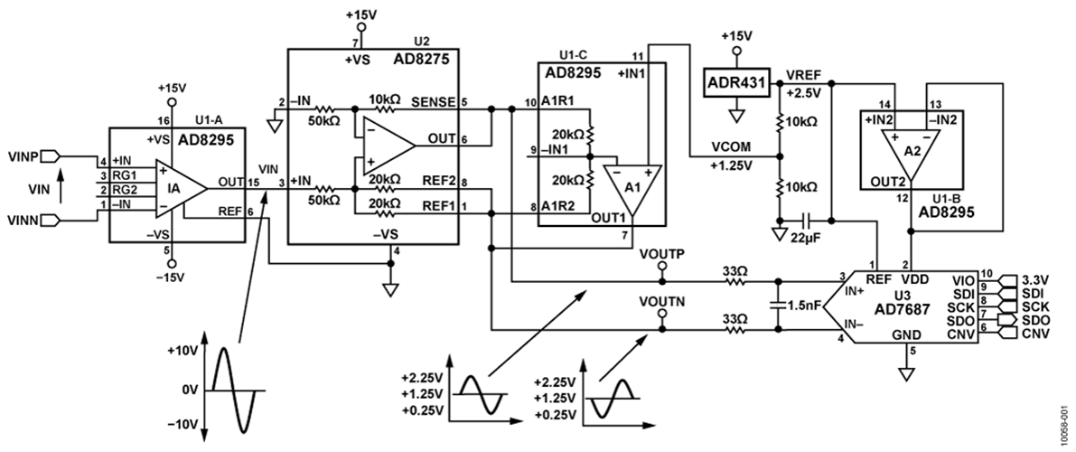该电路由用作模拟前端电路的AD8295和AD8275、ADC AD7687以及基准电压源ADR431组成,只需少量外部元件进行去耦等。