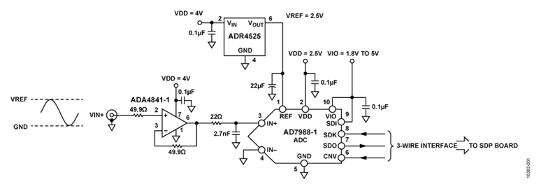 AD7988-1 ADC需要2.4 V至5.1 V间的外部基准电压。本应用中,选择的基准电压是ADR4525 精密2.5 V基准电压源。