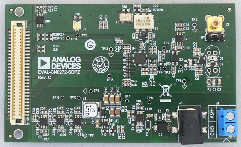 EVAL-CN0272-SDPZ 评估板设计用于 EVAL-SDP-CB1Z SDP-B板,但任何微处理器都可与AD9629-20的并行外设接口(PPI)实现对接。为使另一个控制器能与 EVAL-CN0272-SDPZ 评估板一同使用,第三方必须开发相应的软件。