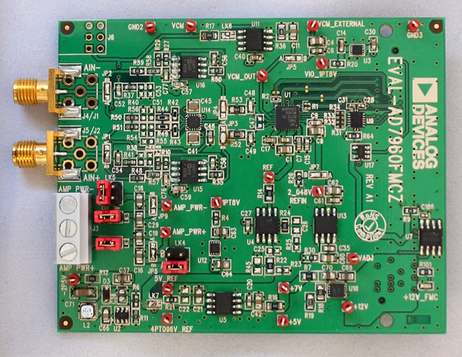 我们开发了 EVAL-AD7960FMCZ 评估板来评估和测试AD7960 ADC。为了测试图1中的电路,使用两个ADA4897-1运算放大器驱动AD7960。