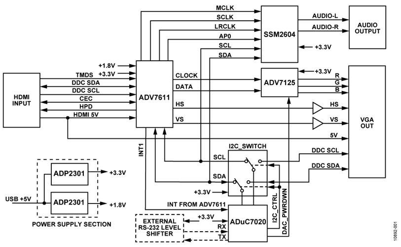 ADuC7020用于读取VGA内容,以确定监视器的能力。典型监视器的VGA EDID不罗列音频能力,并且可能含有ADV7611不支持的视频分辨率(例如超过165 MHz的像素速率以及60 Hz时的1920 × 1200 VESA)。