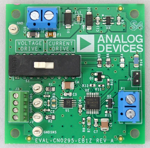 需使用电压驱动或电流驱动,具体取决于所选压力传感器。该电路使用四分之一的ADA4091-4 (U2A),并通过开关S1选择不同配置,支持两种选项之一。图2显示电压驱动配置,S1位置最靠近识别标志(参见CN0295设计支持包中的完整电路布局和原理图:https://www.analog.com/CN0295-DesignSupport。电压驱动通常采用该级的增益(1 + R5/R6)配置为6 V电桥驱动电压。其他驱动电压可通过适当改变电阻比获得: