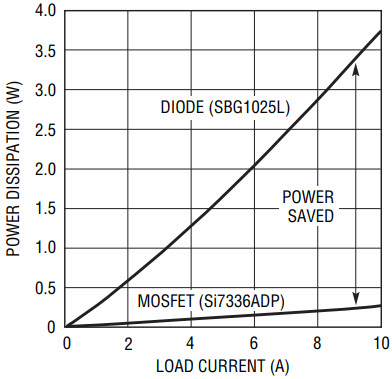 Figure 2. As load current increases, so do the power savings gained from using an ideal diode (LTC4352 + Si7336ADP) instead of a power Schottky diode (SBG1025L).