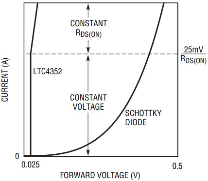 Figure 4. The forward I-V characteristic of the LTC4352 ideal diode vs a Schottky diode.