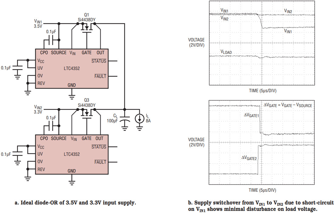 Figure 5 shows a fast switchover event occurring in a 3.3V ideal diode-OR circuit. Initially VIN1 supplies the entire load current since it is higher than VIN2. In this state, MOSFET Q1 is on and Q3 is off. A short circuit causes VIN1 to collapse below VIN2. The LTC4352’s fast response shuts off Q1 and turns on Q3 so that the load current can now be supplied by VIN2. This fast switchover minimizes disturbance on the load voltage so that downstream circuits can continue to operate smoothly.