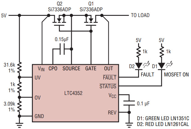 Figure 6 shows the LTC4352 in a 5V ideal diode circuit with undervoltage and overvoltage protection. The UV and OV pins have comparators with a 0.5V trip threshold and 5mV hysteresis (Figure 3). The resistive dividers from the input supply to these pins set up an input voltage window, typically 4.36V to 5.78V, where the ideal diode function operates. The STATUS pin pulls low to light up a green LED whenever the gate is high and power is flowing through the external MOSFET. For VIN outside the input voltage window, the gate is held off and the FAULT pin pulls low to signal a fault condition. A red LED, D2, provides visual indication. Back-to-back MOSFETs are needed to block conduction through their intrinsic source-to-drain body diodes in the gate low condition. A single MOSFET, Q1, could be used in the case where only a VIN out-of-range indication is sufficient. But care should be taken that the load current flowing through Q1’s body diode, when its gate is low, does not cause excessive heat dissipation in the MOSFET.