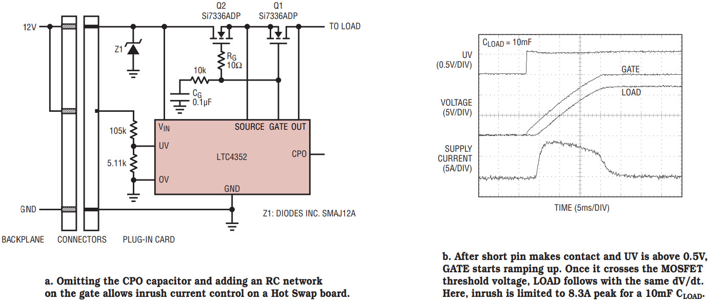 When the diode power input flows across a connector on a hot swap board, the LTC4352 can do double-duty to control the inrush current. Again, back-to-back MOSFETs are required for this application to block conduction through the MOSFET body diodes. The inrush current is limited by slowing the rise rate of the load voltage. This is done by limiting dV/dt on the MOSFET gate and operating it in a source-follower configuration.