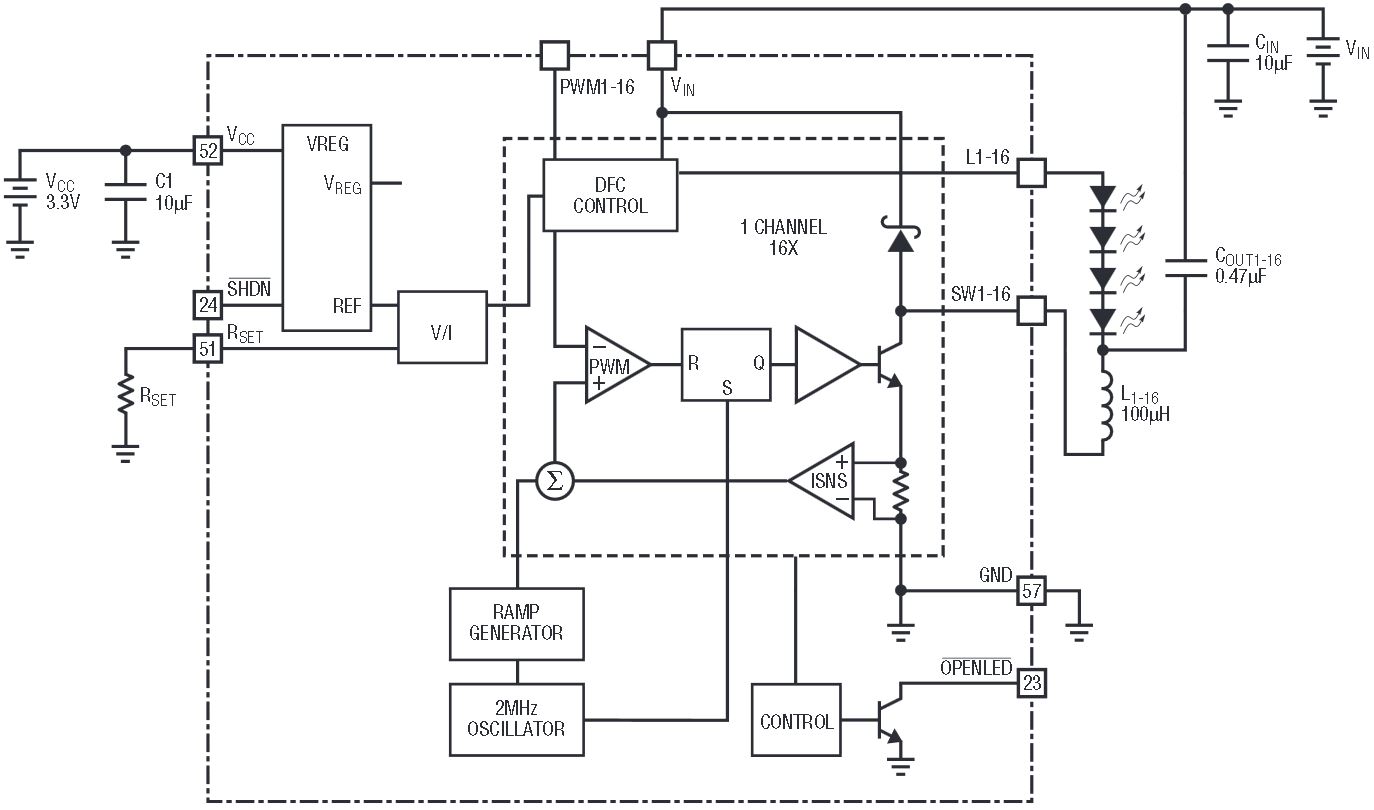 The fixed frequency, current mode control scheme provides stable operation over a wide range of input and output voltages and currents. Direct control of the LED current through internal sense resistors for each channel and internal switches and control circuitry for each channel provide excellent constant current source regulation for LED driving. The internal 100mA power switches and exposed thermal pad of the 56-pin QFN provide enough power and thermal management to handle the power and heat of 16 channels at 50mA.