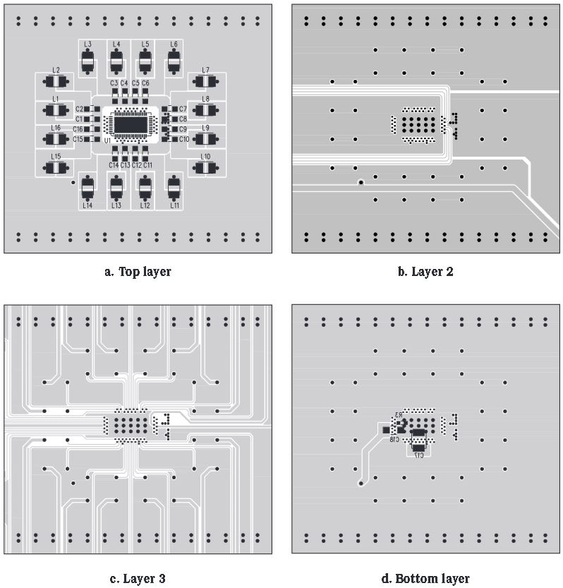 Layout is important for the LT3595. The ground connection is only tied to the thermal pad (pin 57). Therefore, the input capacitors, set resistors, and control logic such as PWM signals, shutdown signal and overtemperature monitor must all be tied to the common ground at the thermal pad. To minimize circuit noise and ripple, it is best if the input capacitors and set resistor are attached to ground on the backside of the board with the shortest connection possible between ground and their respective pins. Figure 6 shows the recommended layout. For a 5mm × 9mm 56-pin QFN package, it may be best if the traces and vias are small. The layout is optimized if vias have a drill size of 6mil (.006 inches) or less with pad of 12mil or less. Clearance between metal traces and pads should be set at 5mil or below.