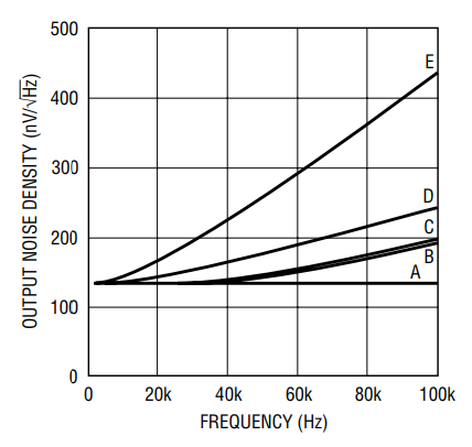 Why is it necessary to have both low voltage noise and low current noise to achieve low total noise in a large-area photodiode transimpedance amplifier? Because the transimpedance circuit’s noise gain, which applies to voltage noise but not to current noise or resistor noise, rises drastically with frequency (noise gain = 1+ ZF/XC). As a sample calculation, a 500pF photodiode has an impedance of 3.2k at 100kHz, giving a 1MΩ transimpedance circuit a noise gain of 314 at that frequency. The theoretical noise floor of the 1M resistor is 130nV/√Hz (at room temperature), so any input voltage noise above 0.41nV/√Hz (130nV/√Hz/314) will overtake the resistor noise at 100kHz. Discrete JFETs are available with ultralow voltage noise but they have high input capacitance (75pF max for the IFN147). Serendipitously, the input capacitance of the JFET is relatively insignificant compared to the 500pF of the example large-area photodiode. Although the capacitance of the JFET increases the overall noise gain slightly, its much lower input voltage noise is well worth the slight increase in total input capacitance and noise gain. Table 1 and Figure 3 show the bandwidth and noise performance achieved with several large-area photodiodes (and include a small-area SFH213 for comparison). Note that large area detectors also place extra demands on the gain bandwidth of an amplifier. The final case in Table 1 shows a 1MΩ transimpedance amplifier with 650kHz bandwidth from a 660pF photodiode. Although this may not seem like much bandwidth, it necessitates a gain bandwidth product of at least 1.8GHz in the amplifier.
