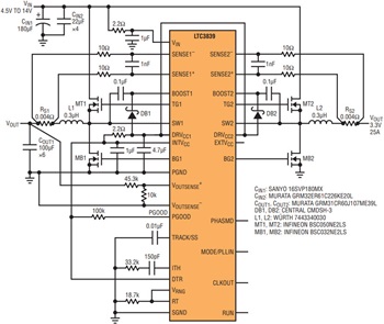 The LTC3838’s dual channels can be configured for either dual- or single-output applications, whereas the LTC3839 is dedicated for single-output applications. Both convert an input of 4.5V to 38V (40V abs max) down to outputs of 0.6V to 5.5V (6V abs max) in applications with per-channel currents up to 25A.