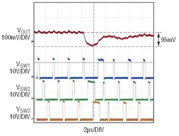 Figure 2 shows the tightly balanced DC current sharing between stages. Dynamic current sharing is also well balanced cycle-by-cycle due to the LTC3829’s peak current mode architecture.