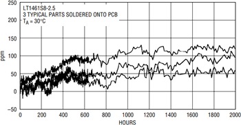 Users encounter several problems when applying precision references and again thermal hysteresis is front and center. When a reference is soldered into a PC board, the elevated temperature and subsequent cooling cause stress that is very different from stress that is caused by automatic testers at the LTC factory. Additionally, there is now an unrelieved mechanical bias on the leadframe when the solder cools. Figure 3 shows the SO-8 LT1461 output shift of about –100ppm after IR soldering onto a PC board. After 336 hours, as the stress relaxes, the output voltage typically shifts about 45ppm back toward the initial state where the device was factory trimmed.