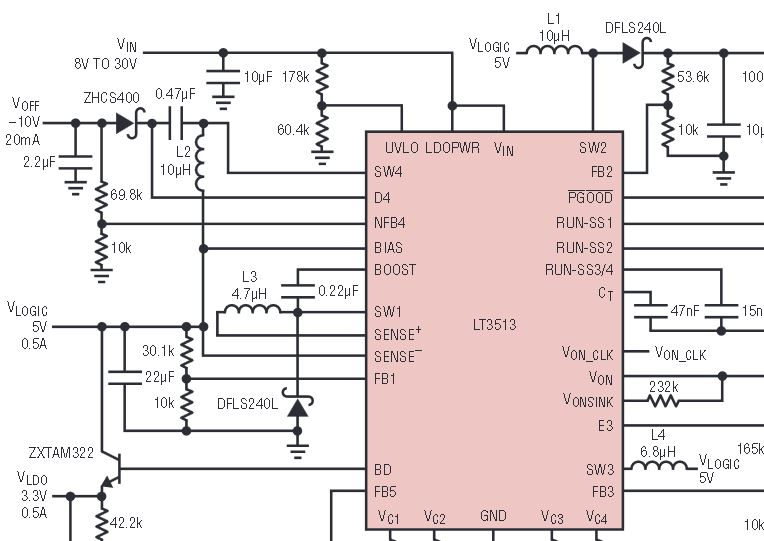 Figure 1 shows a 5-output TFT LCD power supply that can accommodate an 8V to 30V input voltage. The first switching converter produces a 5V logic supply using a buck regulator. The internal linear regulator with an external NPN produces a 3.3V logic supply using the 5V supply as input. The second switcher is used to boost the 5V supply to an 8V, 80mA AVDD bias supply. Another boost converter and an inverter generate VON and VOFF, which also use the 5V supply as input.