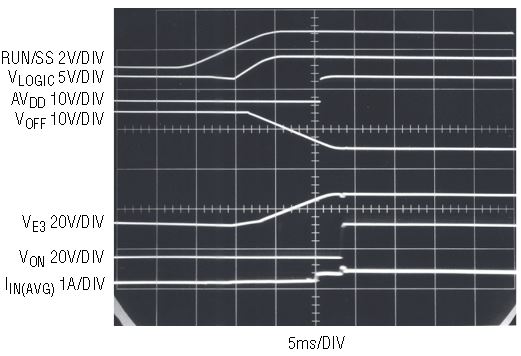 When power is first applied to the input, the RUN-SS1 capacitor starts charging. When its voltage reaches 0.8V, Switcher 1 is enabled. The capacitor at the RUN-SS1 pin controls the ramp rate for the Switcher 1 output, VLOGIC and inrush current in L1. Switchers 2, 3 and 4 are controlled by the BIAS pin, which is usually connected to VLOGIC. When the BIAS pin is higher than 2.8V, the capacitors at the RUNSS-2 and RUN-SS3/4 pin begin charging to enable Switchers 2, 3 and 4. When AVDD reaches 90% of its programmed voltage, the PGOOD pin is pulled low. When AVDD, VOFF and E3 all reach 90% or their programmed voltages, the CT timer is enabled and a 20μA current source begins to charge CT. When the CT pin reaches 1.1V, the output PNP turns on, connecting E3 to VON. Figure 2 shows the start up sequence of the circuit in Figure 1.