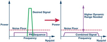 To provide resistance to jamming, systems can be architected by intelligently randomizing and spreading the radar pulses over a wide band so there will only be a very small signal on any one band, which is known as direct sequence spread spectrum (DSSS), as seen in Figure 2. Frequency hop spread spectrum (FHSS) also provides some protection against full-band jamming. In these cases, the wide transmission signal consumes bandwidth that is in excess of what is actually needed for the raw signal of interest. Therefore, a wider receiver bandwidth and higher dynamic range are needed to continue to advance system capability.