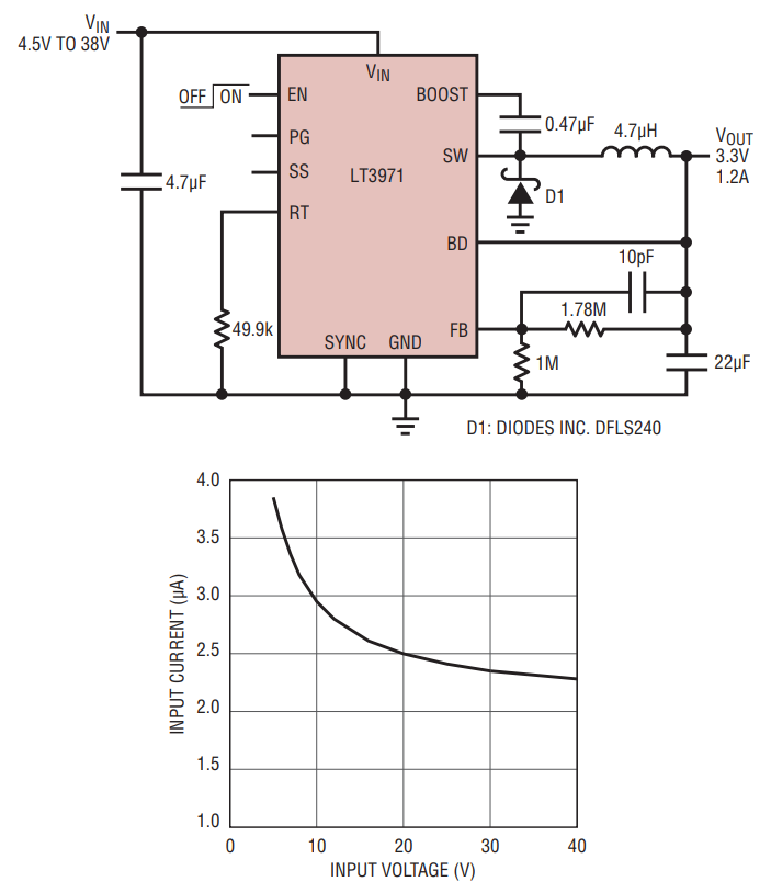 Figure 1. The LT3971 can achieve ultralow input current while regulating a 3.3V output with no load.