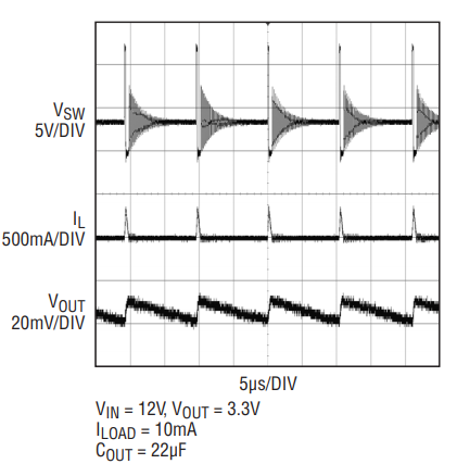 Figure 2. During light loads, the output voltage ripple is controlled by single pulse burst mode. For a 12VIN to 3.3VOUT application with 10mA of load, the output voltage ripple is below 15mV with a 22µF output capacitor.