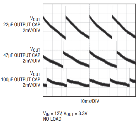 Figure 3. Output voltage ripple decreases with increasing capacitor size in burst mode. The output ripple is about 6mVP–P with a 22µF, 4mVP–P with a 47µF, and 2mVP–P with a 100µF output capacitor. A 0.5 inch lead to a 1µF capacitor is used to help filter the ESL spike on the output and care is taken to measure the ripple directly across the capacitor.