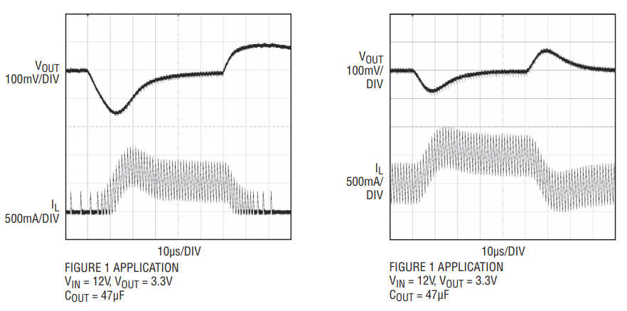 Figure 4. Transient responses for a 25mA to 525mA load step and a 0.5A to 1A load step. The transition between burst mode and full frequency operation is smooth.