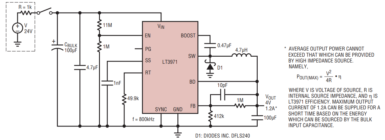 Figure 5. A LT3971 application circuit where the 1MΩ and 11MΩ resistor divider sets a 12V input voltage enable threshold to prevent the 24V, 1kΩ impedance source from collapsing.
