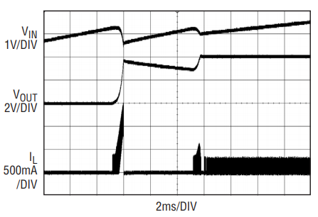 Figure 6. As the output charges to 4V on startup, the 12V VIN(EN) threshold temporarily shuts down the part to prevent the high impedance input source from collapsing.