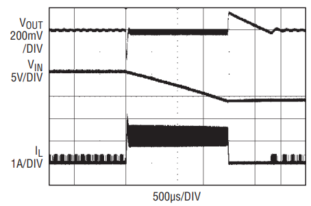 The output cannot, on average, draw more power than the input can supply with its high impedance. However, the LT3971 can source up to the 1.2A maximum output current for a brief time, as long as the energy is supplied by the input capacitance. Figure 7 shows 1.2A of output current being supplied for 2ms from the 100µF bulk input capacitance. The ability of the LT3971 to supply this type of pulsed load is very important for satisfying low duty cycle sensor applications and energy harvesting applications, which take advantage of both the low quiescent current performance and 1.2A maximum load of the LT3971.